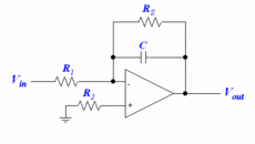 There is a problem with this circuit though—the integrator is only good if the Vout is less than the maximum output voltage of the op-amp. Our integrator is thus not very useful for low frequency signals, because the charge will store up on the capacitor and eventually saturate the op-amp. Even if we have a high frequency signal, any DC offset will add up in the capacitor over time. We can remedy this problem by adding a shunt resistor Rs across the capacitor to bleed off any long-term charges that store up in the capacitor. As a rule of thumb, Rs should be greater than 10R1.