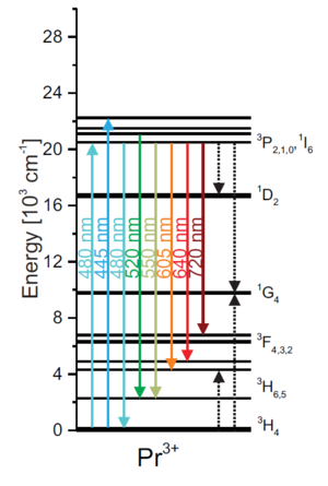 ==== <math>\text{Pr}^{+3}</math>-doped lasers ==== | ==== <math>\text{Pr}^{+3}</math>-doped lasers ==== | ||