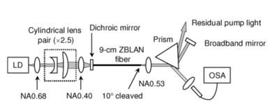 [[File:Pr-ZBLAN-schematic.PNG|thumb|500px|center|Experimental setup of 9-cm Pr:ZBLAN laser]]